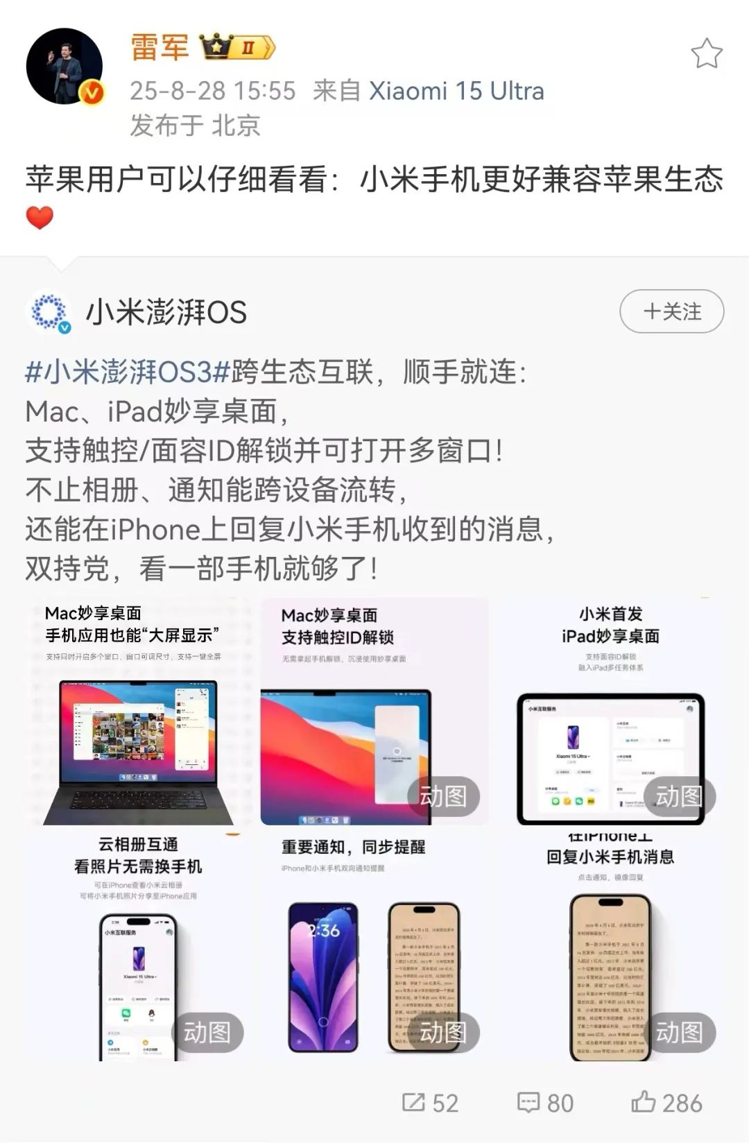 当天,小米集团创始人、董事长兼CEO雷军在其社交平台发文称:“苹果用户可以仔细看看:小米手机更好兼容苹果生态。”
